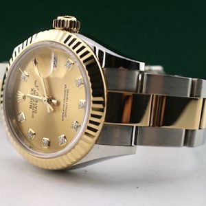 This luxurious Rolex Datejust 28 watch is a stunning accessory for any woman. With a stainless steel case and 18k gold bezel and a band made of both stainless steel and yellow gold, it is an elegant combination of materials. The watch features a mechanical (automatic) movement, analog display, and diamond markers