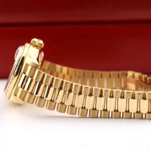 This stunning Rolex Lady-Datejust 69178 President Bracelet is the perfect accessory for any luxurious outfit. The watch features a sunburst dial pattern with diamond markers and round indexes, all enclosed in a solid yellow gold case with a fluted bezel. The bracelet is made of the same yellow gold material and has a concealed folding crownclasp closure.