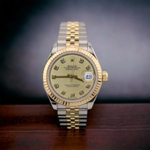 Rolex 18k yellow gold two tone with jubilee bracelet and fluted bezel. Mesmorizing factory diamond and champagne dial. This stunning piece is sure to be on every southern ladies wish list.