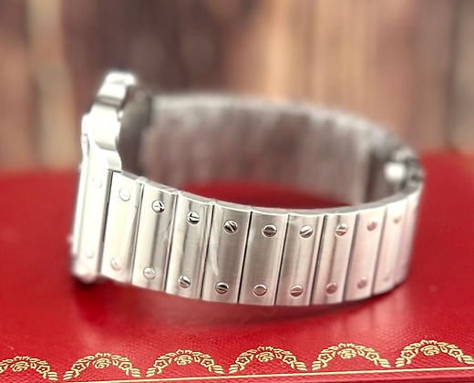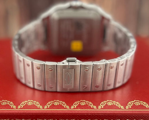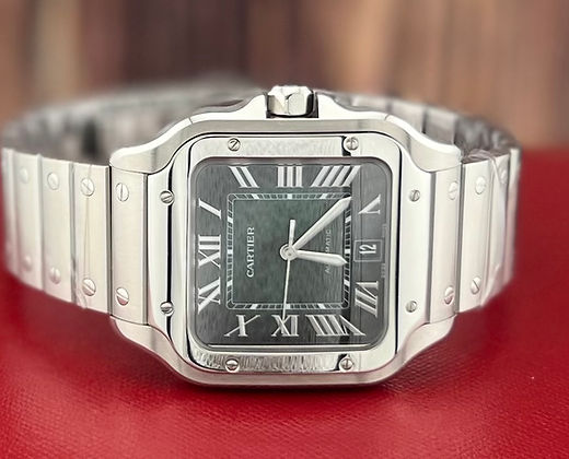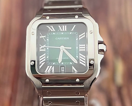Relax on the Carolina shores with this new/never worn Santos de Cartier – hard to find green dial in large.