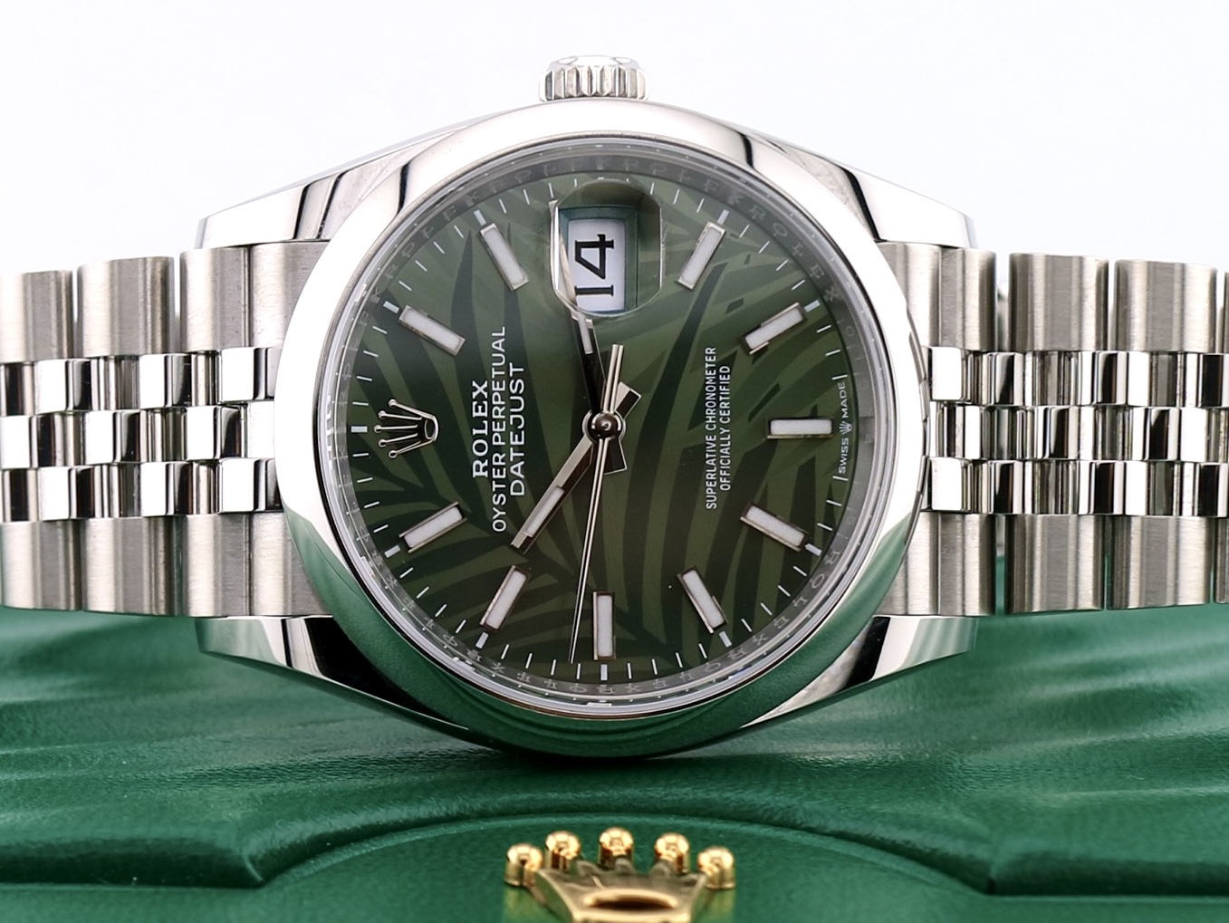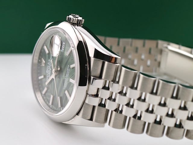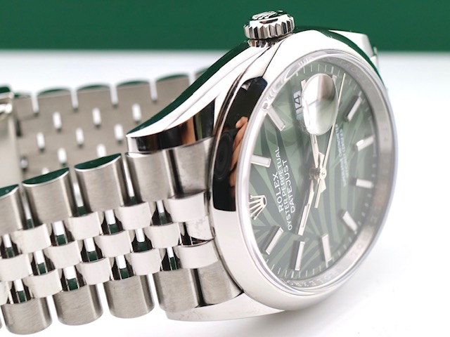Unique and hard to find green palm dial – perfect for the southern gentleman or lady. Reminiscent of the sandy beaches of the bahamas. Hit the sand and then the perfect night out with this luxurious piece