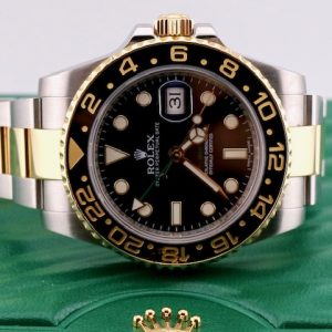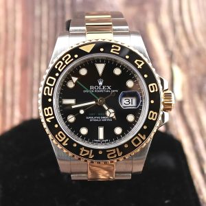 There is nothing like the beauty of Rolex 2 tone watches. This GMT Master boasts 18k and stainless steel bracelet along with the 18k bezel. Dressy enough to for the night out yet keeps multi timezones for the world traveler