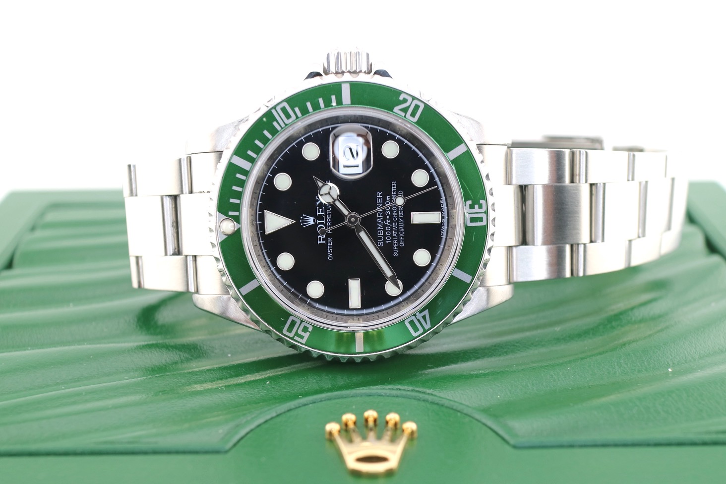 Newer and collectible Rolex Submariner – black dial – green bezel insert – Kermit the frog. Engraved rehaute and very nice preowned condition This is a must for every collectors or enthusiasts collection.