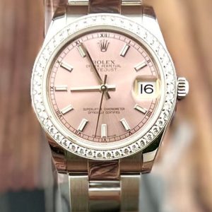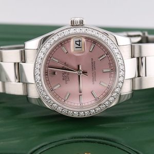 Treat yourself or your special someone with this ladies 31mm Rolex Datejust 31mm pink dial and diamond bezel. Sublte yet stunning fashion accessory for your next night out on the town