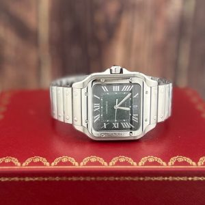 Relax on the Carolina shores with this new/never worn Santos de Cartier - hard to find green dial in large. compare at online prices at $8450-9450 Model: WSSA0062 Year:2023 Size: 39.8mm Case Material: steel Bracelet: steel Movement: Must de Cartier Automatic Includes: inner/outer box, booklets, warranty card, hangtags - additional aligator green strap