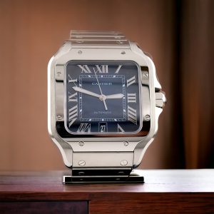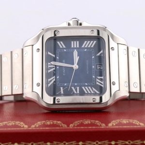 Elevate your style with the Cartier Santos Blue Men's Stainless Steel Bracelet Watch. This luxury wristwatch boasts a 40 mm case made of high-quality stainless steel with a screwed bezel type and Roman Numerals indices. It features a beautiful blue dial color that perfectly complements its silver bezel and bracelet band. reference: WSSA0030 case: stainless steel bracelet: stainless steel and leather band size: 40mm movement: Cartier automatic condition: new/unworn includes: inner/outer box, booklets, tags, warranty card dated 2023