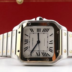 This elegant Cartier Santos de Cartier wristwatch is a perfect blend of luxury and style. The watch features a silver case with a screwed gold bezel and a silver dial with Roman numerals and pinstripe pattern. It is water-resistant up to 100m and has a self-winding chronograph movement. Brand - Cartier ref - W2SA0007 case size - 35mm case material - stainless steel/18K gold bracelet material - stainless steel movement - Cartier automatic condition - new/unworn year - 2020 comes with inner/outer box - booklets - warranty card dated 2020-extra leather strap - Cartier tool - strap buckle
